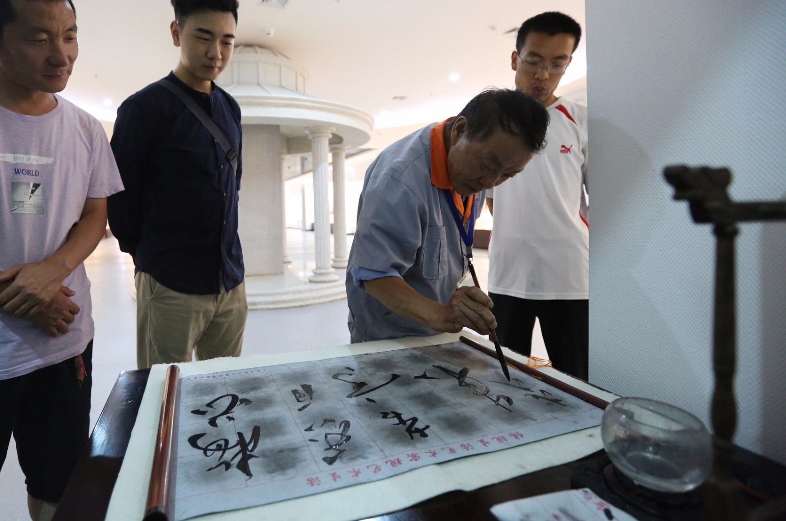 高校保洁员成书法家 3年送学生800幅作品