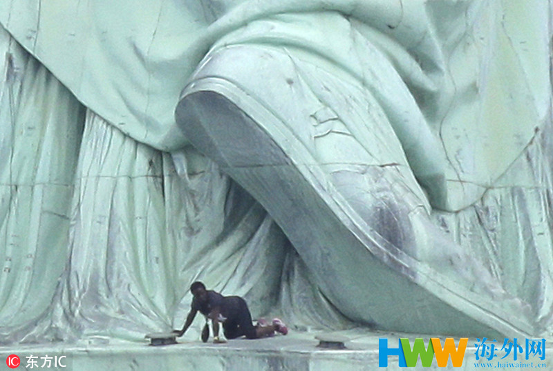 美国独立日出“闹剧” 女子攀爬自由女神像抗议险象环生