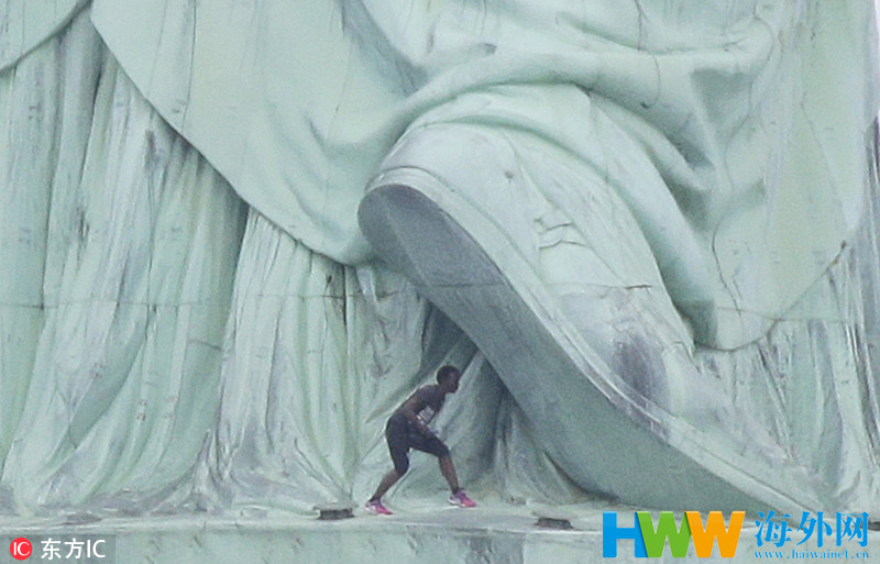 美国独立日出“闹剧” 女子攀爬自由女神像抗议险象环生