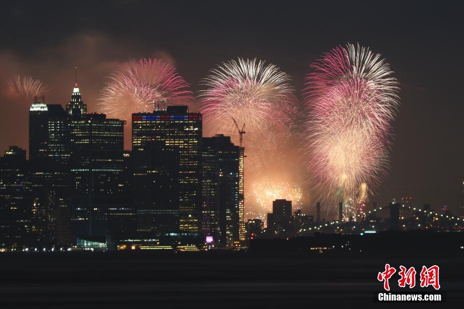 当地时间7月4日夜间,庆祝独立日的焰火在美国纽约曼哈顿上空绽放。独立日也是美国的国庆日。中新社记者 廖攀 摄