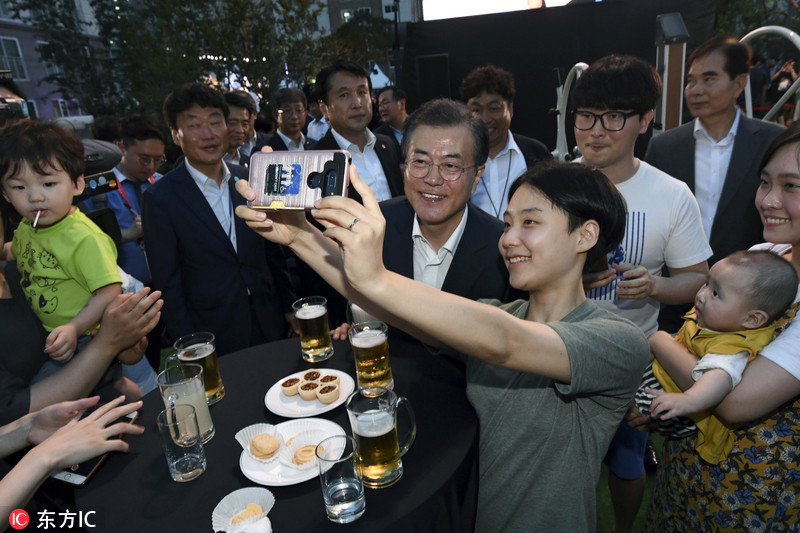 当地时间2018年7月5日,韩国首尔,韩国总统文在寅出席一场针对新婚夫妇住房保障的公开活动,发表讲话还与民众热情互动。