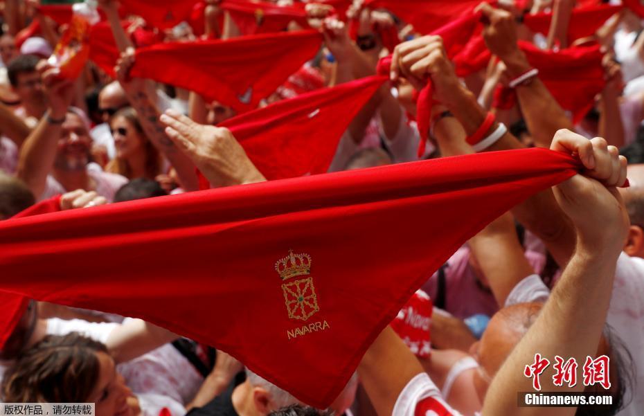 民众高举红布庆祝西班牙奔牛节