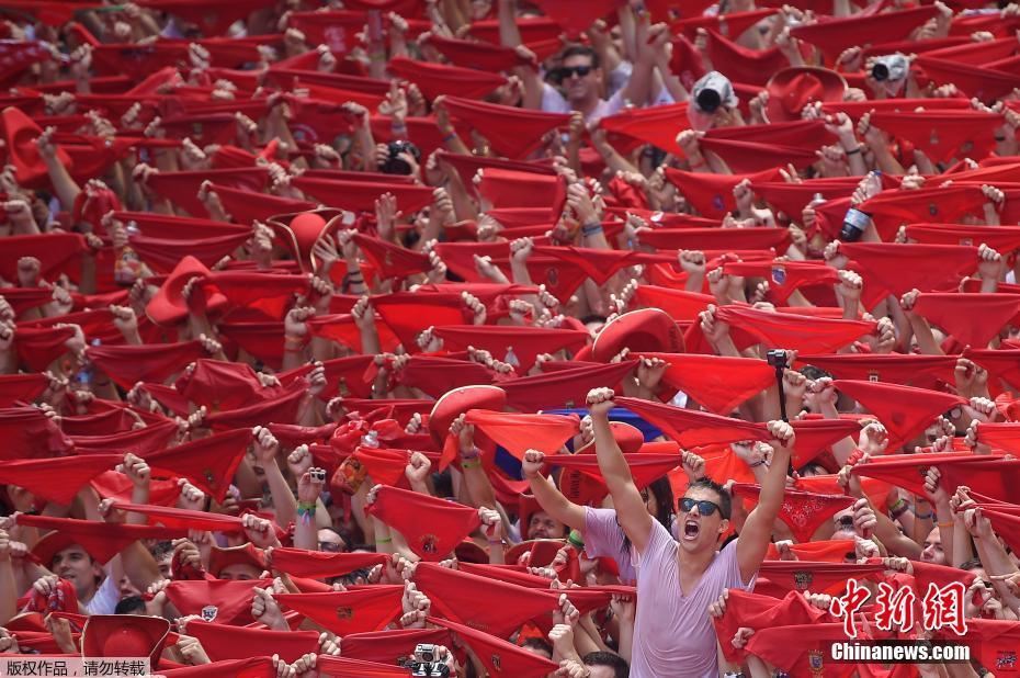 当地时间7月6日,狂欢者在西班牙潘普洛纳高举红布庆祝圣佛明节(奔牛节)。7月6日是西班牙的圣佛明节,这一天,会有颈间系着红领巾,带着红帽,穿着传统服装的男子在街头举行游行活动。