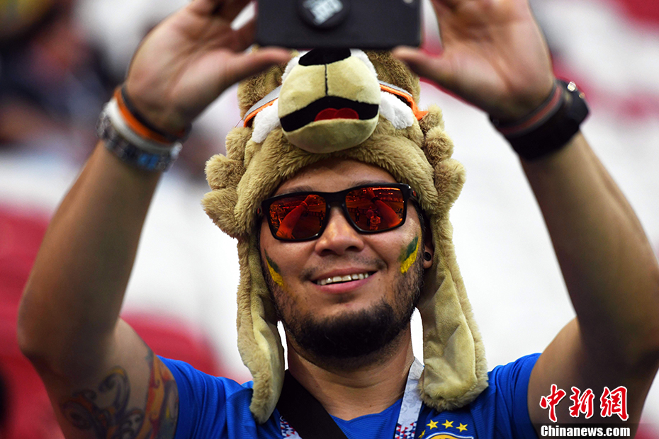 一位头戴吉祥物的球迷在自拍。 中新社记者 田博川 摄