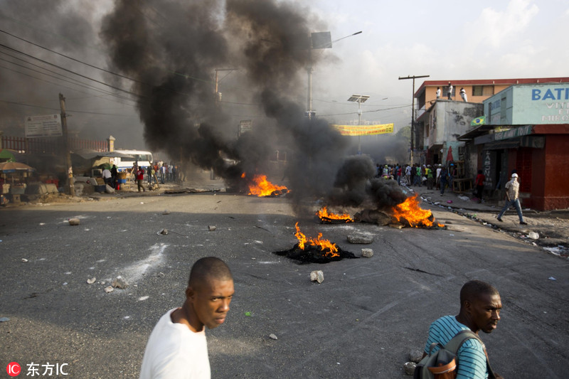 当地时间2018年7月6日,海地太子港,当地民众示威抗议政府上调石油价格,焚烧路障以及轮胎封堵主要街道。