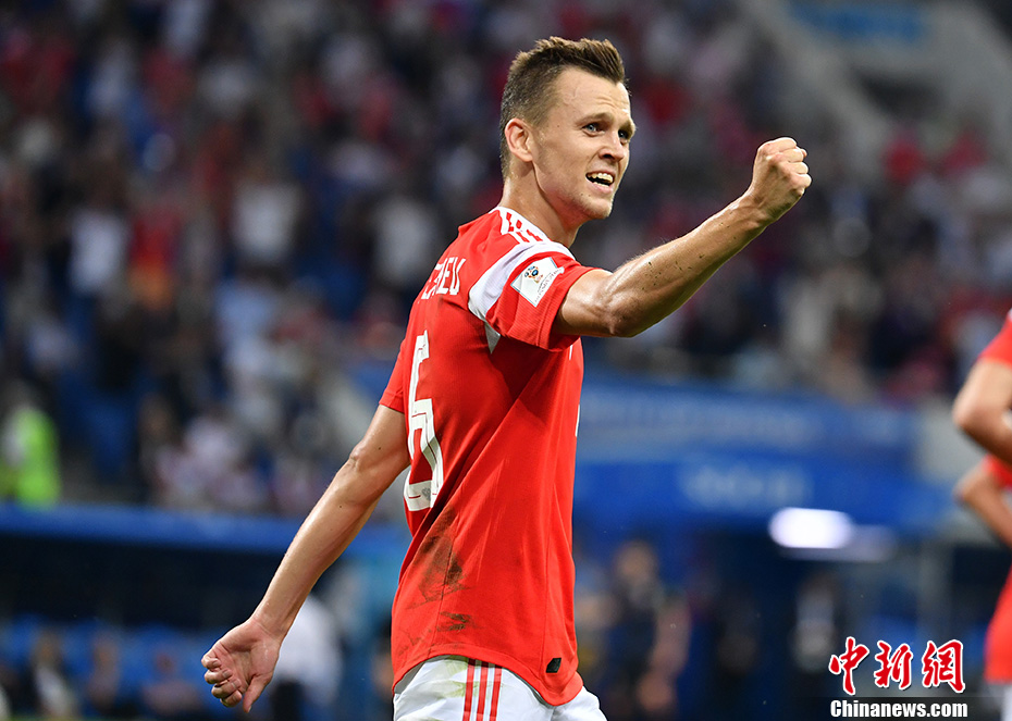 第31分钟,俄罗斯队打破场上僵局!高中锋久巴和切里舍夫在前场做配合,切里舍夫得球后用左脚突施冷箭,皮球直挂球门左上角入网,克罗地亚门将苏巴西奇毫无反应。图为切里舍夫庆祝进球。 中新社记者 毛建军 摄