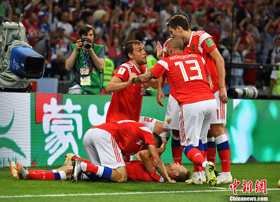 第31分钟,俄罗斯队打破场上僵局!高中锋久巴和切里舍夫在前场做配合,切里舍夫得球后用左脚突施冷箭,皮球直挂球门左上角入网,克罗地亚门将苏巴西奇毫无反应。图为俄罗斯队庆祝进球。 中新社记者 毛建军 摄