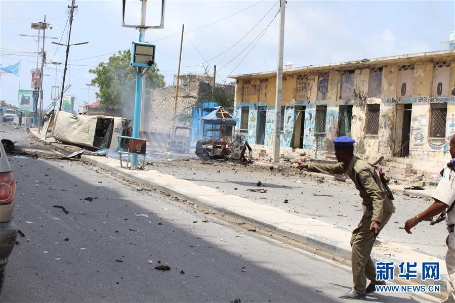 7月7日,在索马里首都摩加迪沙,一名警察伸手指向一处爆炸地点。