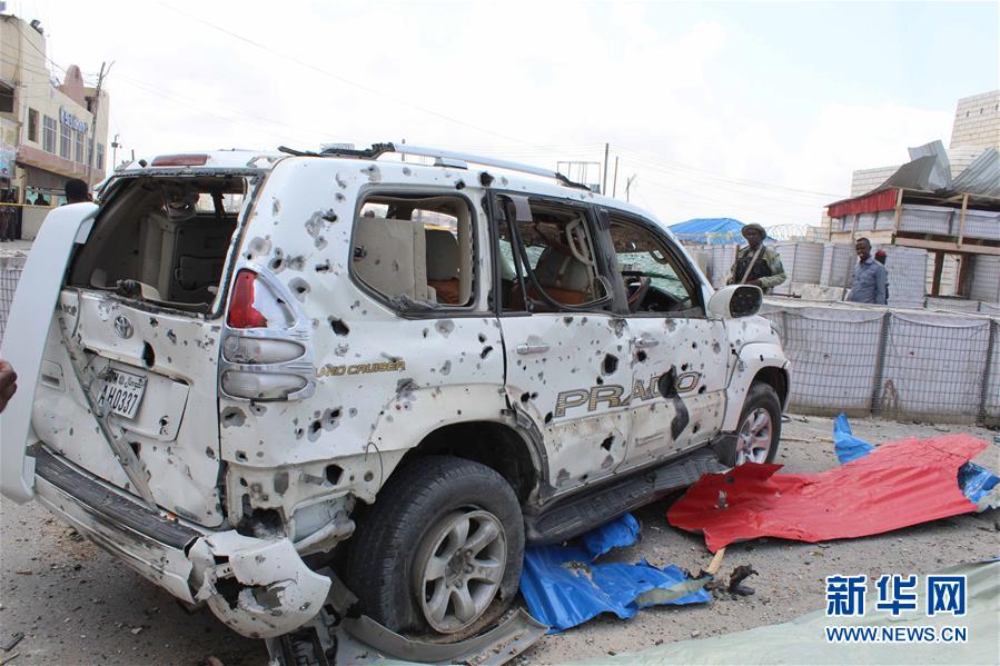 这是7月7日在索马里首都摩加迪沙爆炸袭击现场拍摄的被毁车辆。索马里警方说,位于首都摩加迪沙的国内安全部大楼及总统府附近的一个安检点,7日分别遭到索马里“青年党”袭击,已造成至少12人死亡。新华社发(费萨尔·伊塞摄)
