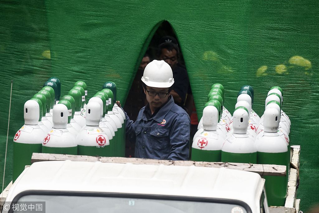 泰溶洞救援进行中 救援人员运送大量氧气瓶