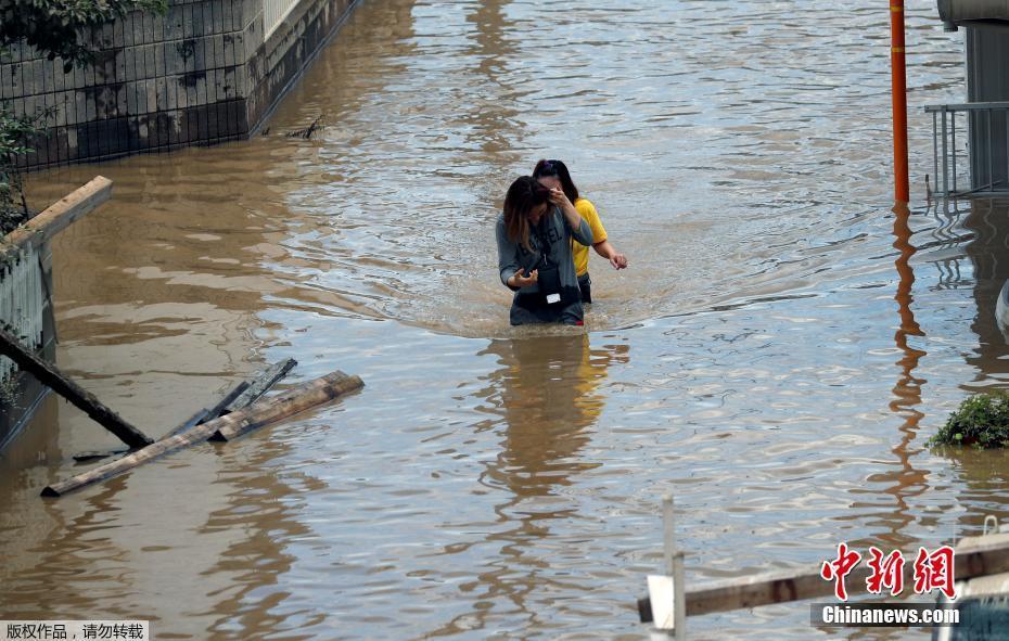 据日媒报道,8日,日本警方和自卫队继续在暴雨灾情严重的冈山、广岛和爱媛各县等搜寻失联者。截至目前,死亡人数已升至总计70人。图为仓敷市街道被水淹没,两名女子在水中跋涉。