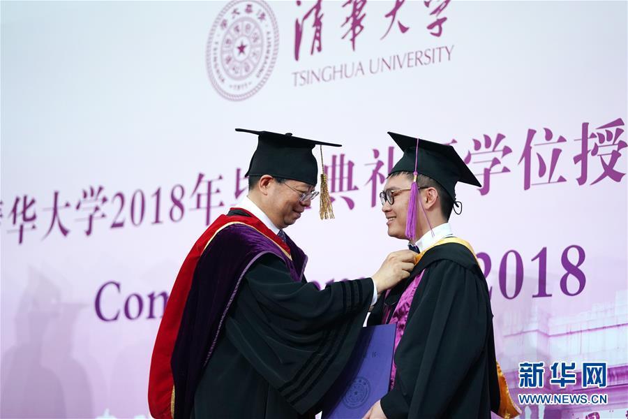 7月8日,清华大学校长邱勇(左)为一位本科毕业生整理学位服。当日,清华大学2018年本科生毕业典礼暨学位授予仪式在清华大学综合体育馆举行,3000余名本科毕业生身着学位服参加典礼。新华社记者鞠焕宗 摄