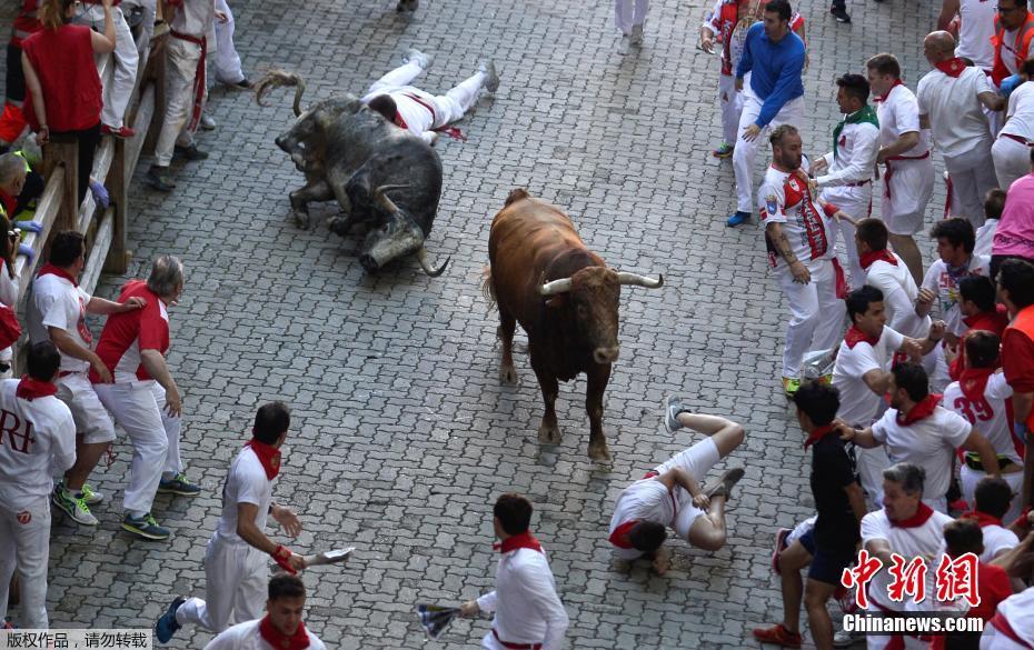西班牙奔牛节 挑战者与公牛进行"巷战"