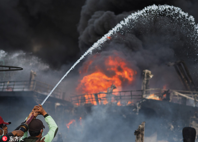 当地时间2018年7月9日,印尼巴厘岛,Benoa港发生火灾,数十艘停泊在港口处的渔船被烧着,现场黑烟滚滚。