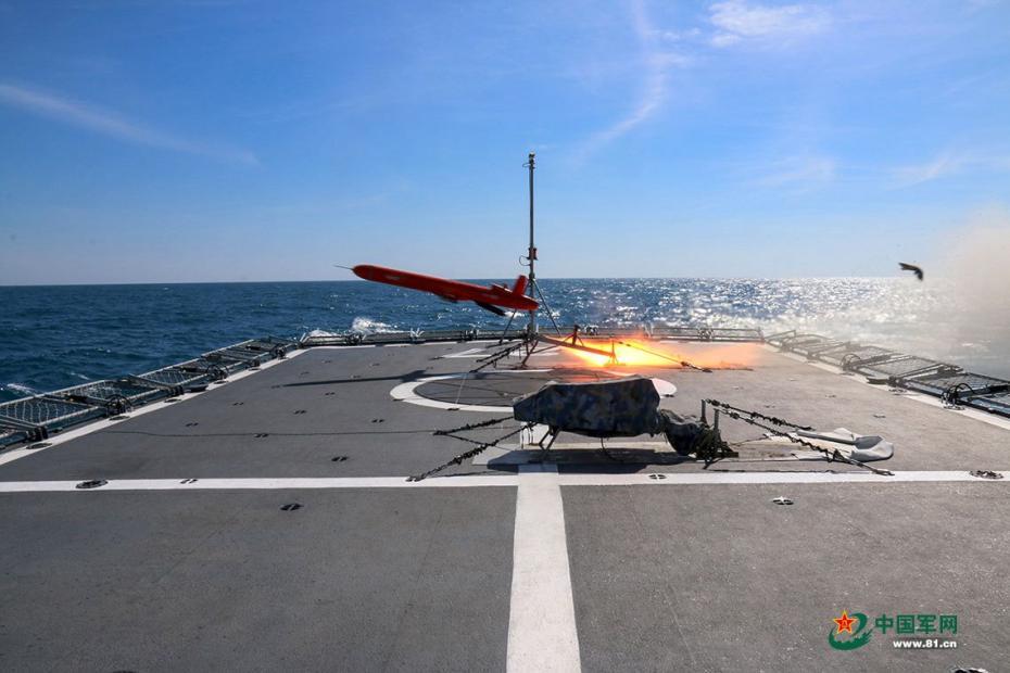 编队各舰驶离码头后,立即分航出击。随着一阵急促的警报声响起,单舰主炮对海射击训练旋即上演,各战位协同紧密,训练高潮迭起。图为靶机起飞。蔡盛秋 孙浩钧 周腾飞 摄影报道 图片来源:中国军网