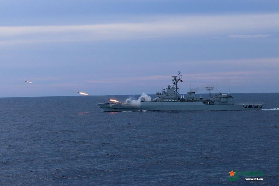 海面上数个目标被击沉后,编队又接到防空警报。笔者在梅州舰作战指挥室注意到,编队立即组成防空队形,各种作战数据在方寸荧屏间闪烁不停。同时,舰炮系统、舰空导弹系统等各武备平台紧张运行。“雷达受强电磁干扰!”刚刚在荧屏上闪露的两个小目标极速移动,尽管各舰艇雷达迅速捕捉判别,突如其来的特情,还是打了编队一个措手不及。图为绵阳舰发射火箭深弹。蔡盛秋 孙浩钧 周腾飞 摄影报道 图片来源:中国军网
