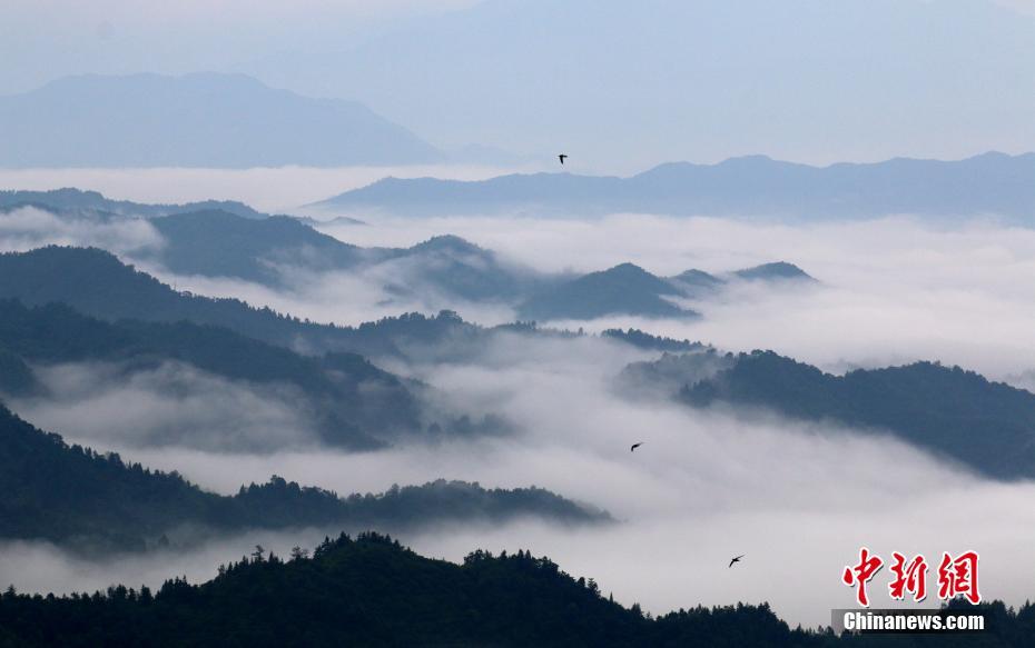 7月9日,在江西省遂川县大坑乡佛祖仙,缭绕的云雾在山谷之间不断涌动,美不胜收。山峰在云雾中若隐若现,犹如人间仙境。那些缠绕在半山的云雾,像系在山腰间的一条条玉带,在山间游动,绘就了一幅幅水墨丹青画。李建平 摄