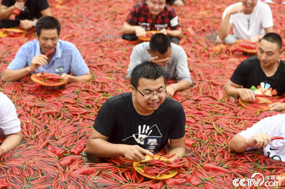 2018年7月8日,湖南宁乡炭河古城举办吃辣椒挑战赛,众多挑战者坐在铺满辣椒的近200平米的巨型蓄水池中进行吃辣椒比拼。最终,来自宁乡的市民唐帅辉在一分钟内狂吞50个辣椒获得最后的冠军。 视觉中国