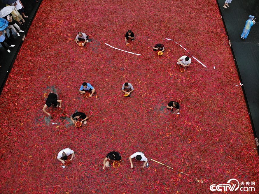 2018年7月8日,湖南宁乡炭河古城举办吃辣椒挑战赛,众多挑战者坐在铺满辣椒的近200平米的巨型蓄水池中进行吃辣椒比拼。最终,来自宁乡的市民唐帅辉在一分钟内狂吞50个辣椒获得最后的冠军。 视觉中国