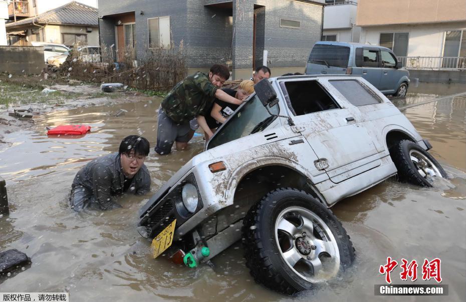 当地时间7月9日,日本冈山县仓敷市民众正在打捞被洪水围困的汽车。