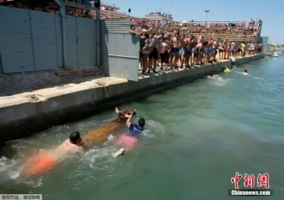 西班牙东部上演"奔牛入海" 人牛狂奔跳海场面热闹