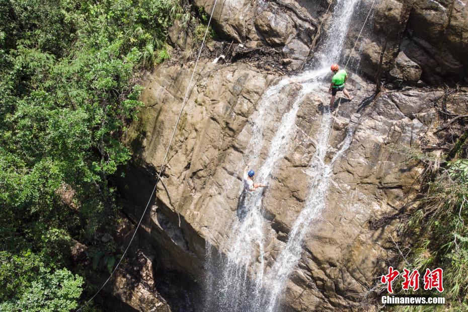 两位挑战者相互配合进行瀑布速降。 杨华峰 摄