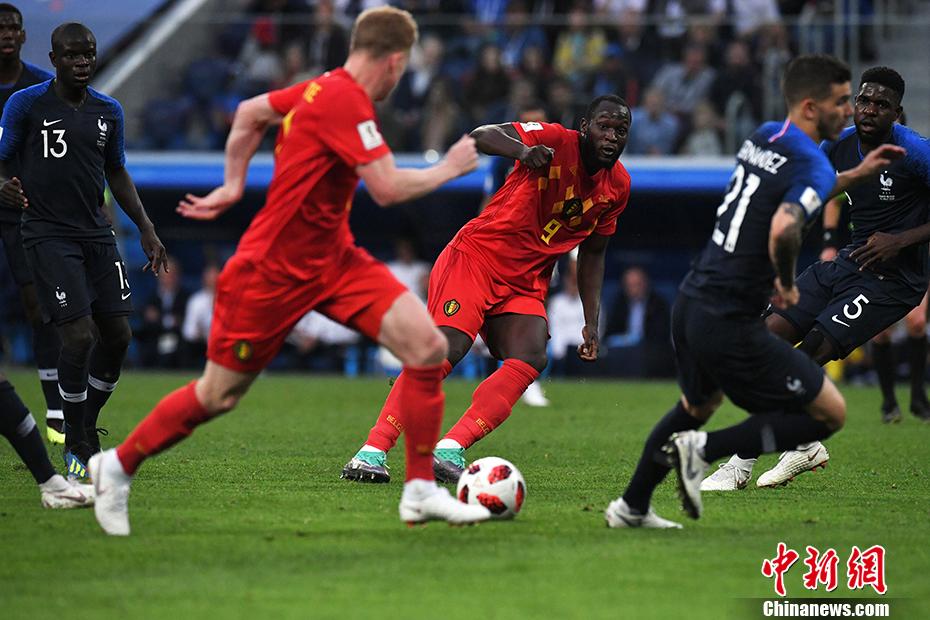领先1球的法国队越踢越保守。面对法国队的密集防守,第60分钟,比利时率先做出换人调整,用默滕斯换下登贝莱,比利时将加强进攻。上场后,默滕斯便展现出效果,右路起脚传中,费莱尼强力头球攻门,球稍稍偏出。图为卢卡库传球。 中新社记者 田博川 摄