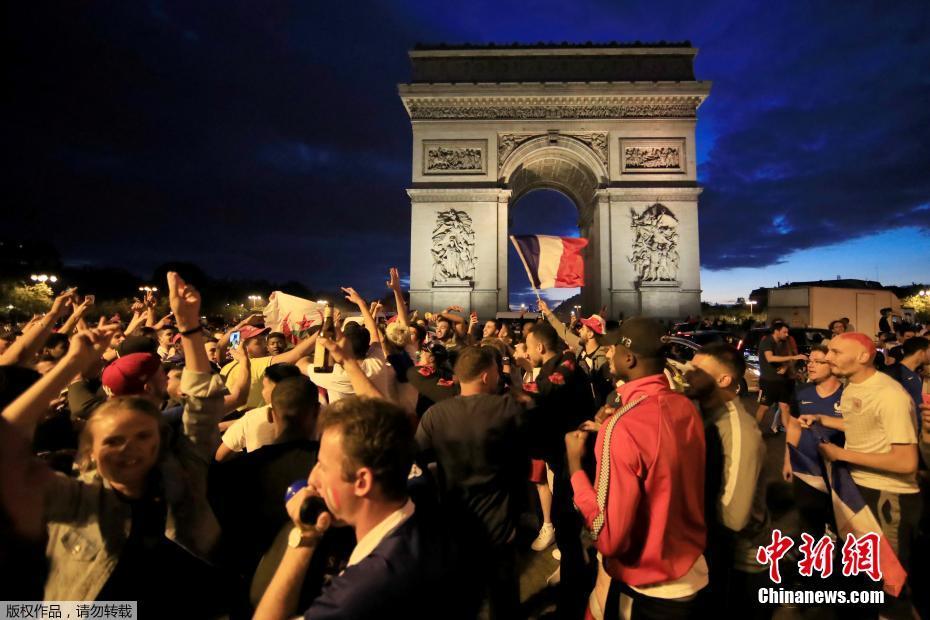 球迷们手持照明弹和旗帜庆祝在巴黎街头、凯旋门进行庆祝。