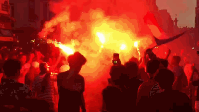 图为法国球迷在街道燃放烟火庆祝 图片来源:SUZIR