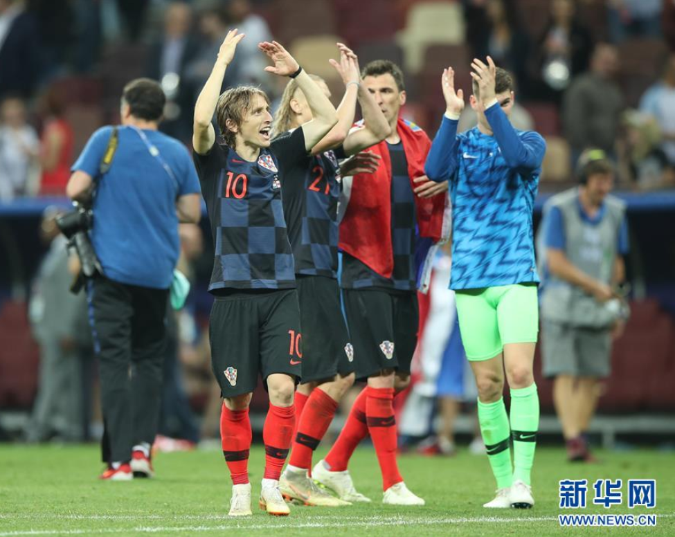 7月11日,克罗地亚队球员莫德里奇在比赛后庆祝胜利。当日,在莫斯科进行的2018俄罗斯世界杯足球赛半决赛中,克罗地亚队与英格兰队在90分钟内战成1比1平。最终,克罗地亚队经过加时赛以2比1战胜英格兰队,历史上首次晋级世界杯决赛。新华社记者 吴壮 摄