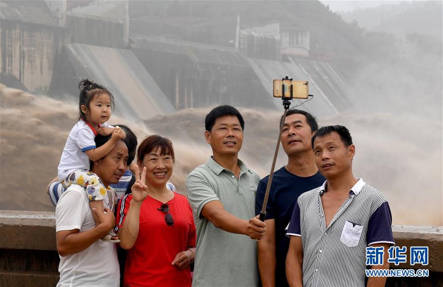 7月11日,游客在黄河小浪底水利枢纽工程旁合影。近日,黄河小浪底水利枢纽工程开启洪水调度运用模式,水流携带泥沙奔涌而出,壮美如画。 新华社发(李嘉南摄)