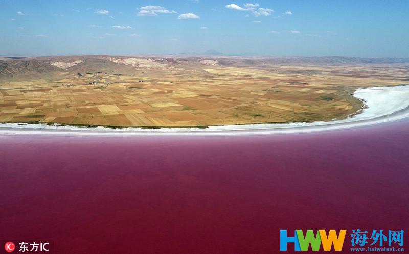 土耳其盐湖盐藻生长 让湖水变成浪漫粉色