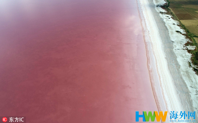土耳其盐湖盐藻生长 让湖水变成浪漫粉色