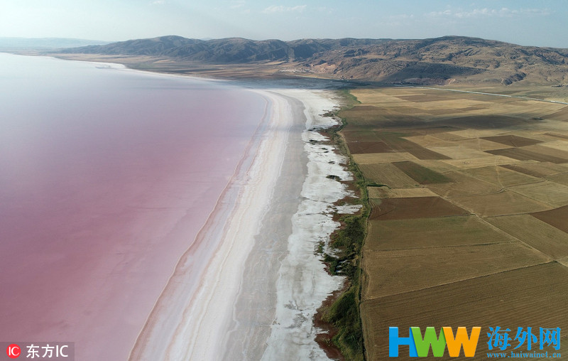 土耳其盐湖盐藻生长 让湖水变成浪漫粉色