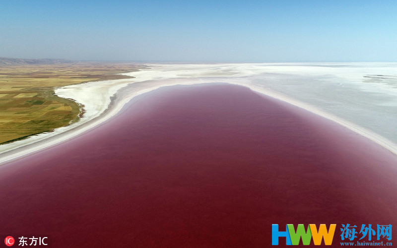 土耳其盐湖盐藻生长 让湖水变成浪漫粉色