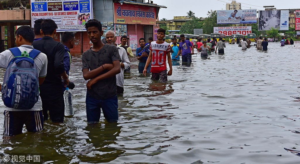 当地时间2018年7月11日,印度孟买,由于连日暴雨,道路出现积水影响民众出行。Hindustan Times/视觉中国
