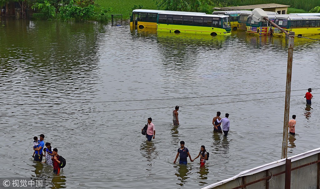 当地时间2018年7月11日,印度孟买,由于连日暴雨,道路出现积水影响民众出行。Hindustan Times/视觉中国