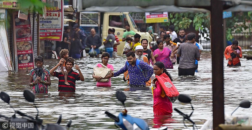 当地时间2018年7月11日,印度孟买,由于连日暴雨,道路出现积水影响民众出行。Hindustan Times/视觉中国