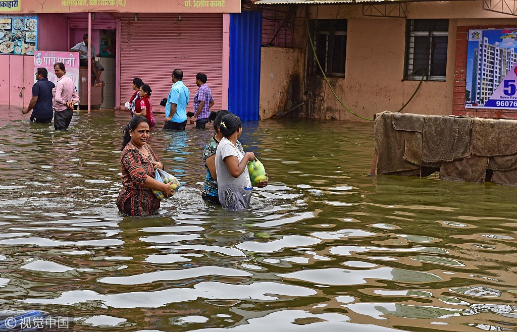 当地时间2018年7月11日,印度孟买,由于连日暴雨,道路出现积水影响民众出行。Hindustan Times/视觉中国