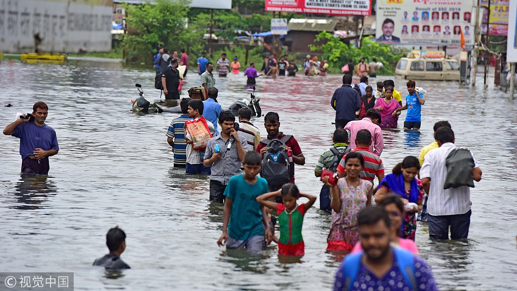 当地时间2018年7月11日,印度孟买,由于连日暴雨,道路出现积水影响民众出行。Hindustan Times/视觉中国