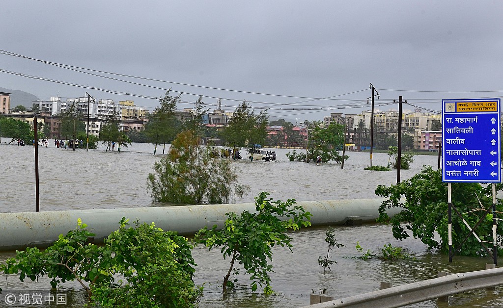 当地时间2018年7月11日,印度孟买,由于连日暴雨,道路出现积水影响民众出行。Hindustan Times/视觉中国