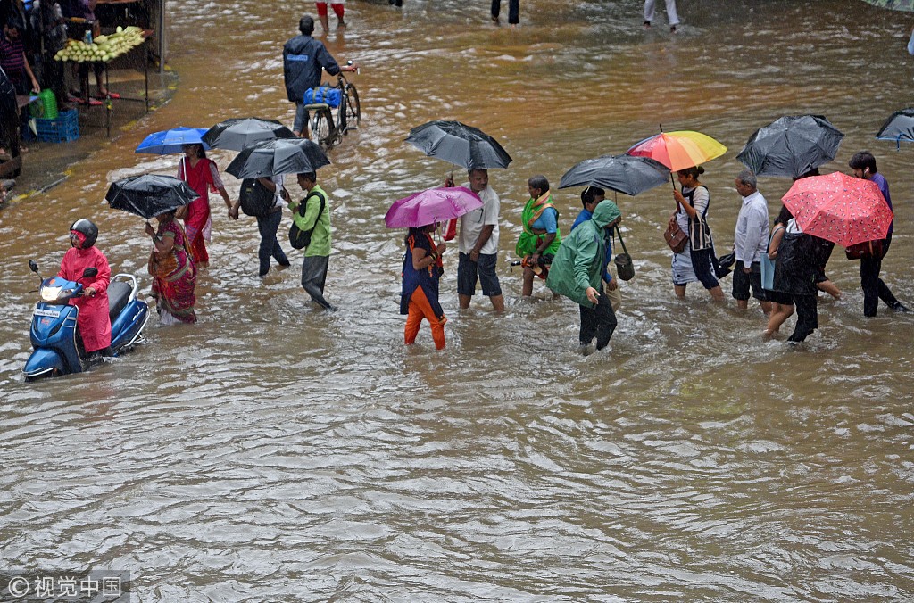当地时间2018年7月11日,印度孟买,由于连日暴雨,道路出现积水影响民众出行。Hindustan Times/视觉中国