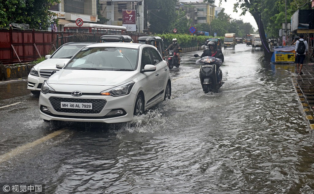 当地时间2018年7月11日,印度孟买,由于连日暴雨,道路出现积水影响民众出行。Hindustan Times/视觉中国