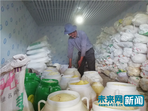 7月13日下午,切得在合作社整理冷库中存储的鲜奶。未来网记者贺卓辉 摄