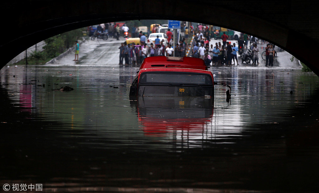 印度多地遭暴雨洪涝 汽车桥下被淹只露车顶