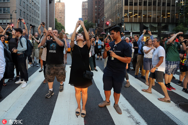 "曼哈顿悬日"再现纽约 路人围观交通瘫痪