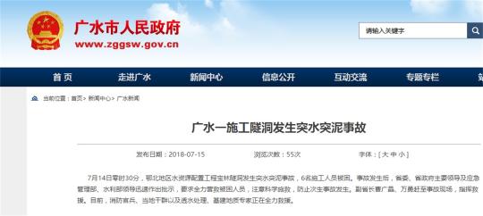 中新网武汉7月15日电 据湖北广水市政府官网15日通报,目前该市相关部门正在全力营救因隧洞事故被困的6名施工人员。