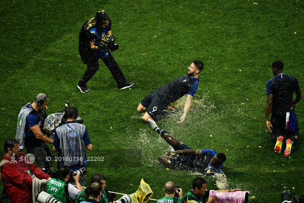 2018俄罗斯世界杯落幕,法国队4:2战胜克罗地亚,“高卢雄鸡”时隔20年再次捧起大力神杯,图为法国队庆祝夺冠。