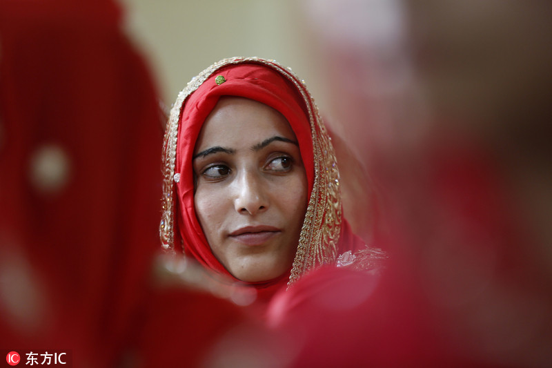 当地时间2018年7月15日,印控克什米尔斯利那加,当地的穆斯林社区为105对来自经济困难家庭的穆斯林新人举办集体婚礼。