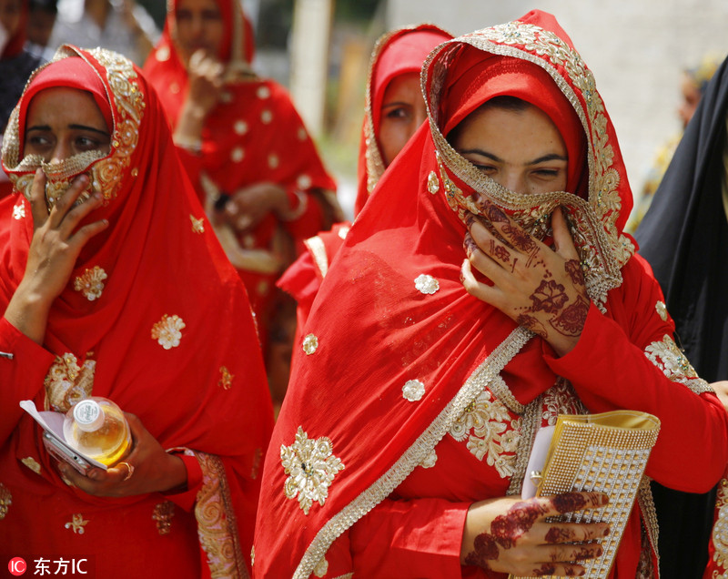 当地时间2018年7月15日,印控克什米尔斯利那加,当地的穆斯林社区为105对来自经济困难家庭的穆斯林新人举办集体婚礼。